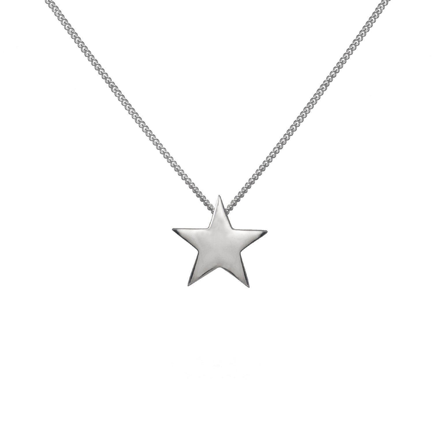 A hallmarked solid sterling silver star pendant. This thick five point polished star is classic, iconic and oh so cute! It has a hidden pendant bale and comes on a 16"-18"/40-45cm diamond cut curb chain with Edge Only's custom tag (choice of two length options). From the Megastar Collection.