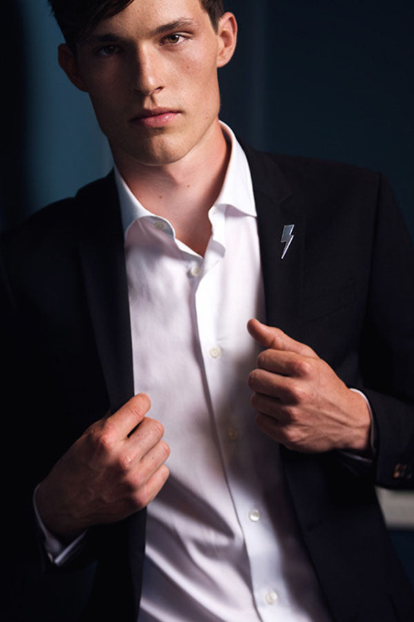 Our signature bolt: A large flat top lightning bolt lapel pin that looks as cool on a woman's jacket as it does on a man's. This unisex pin comes with a nickel silver clutch back.