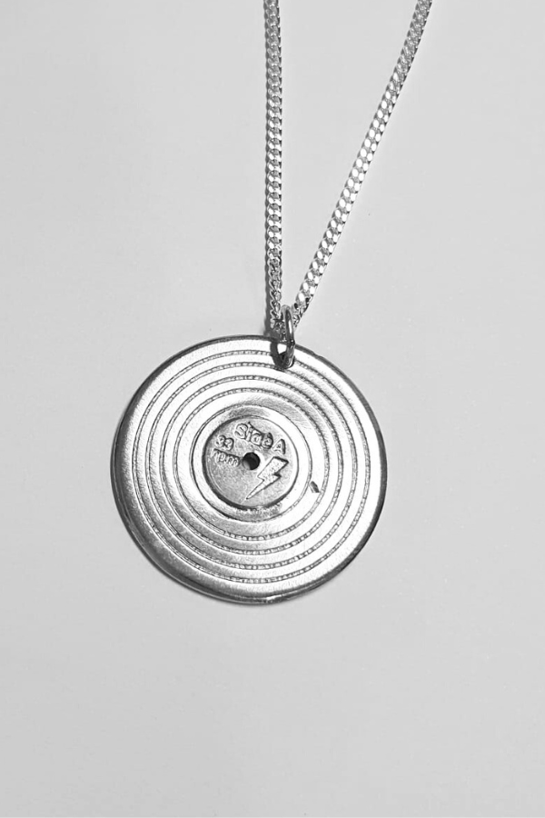A solid 100% recycled sterling silver Vinyl Pendant with all the details. Unisex.