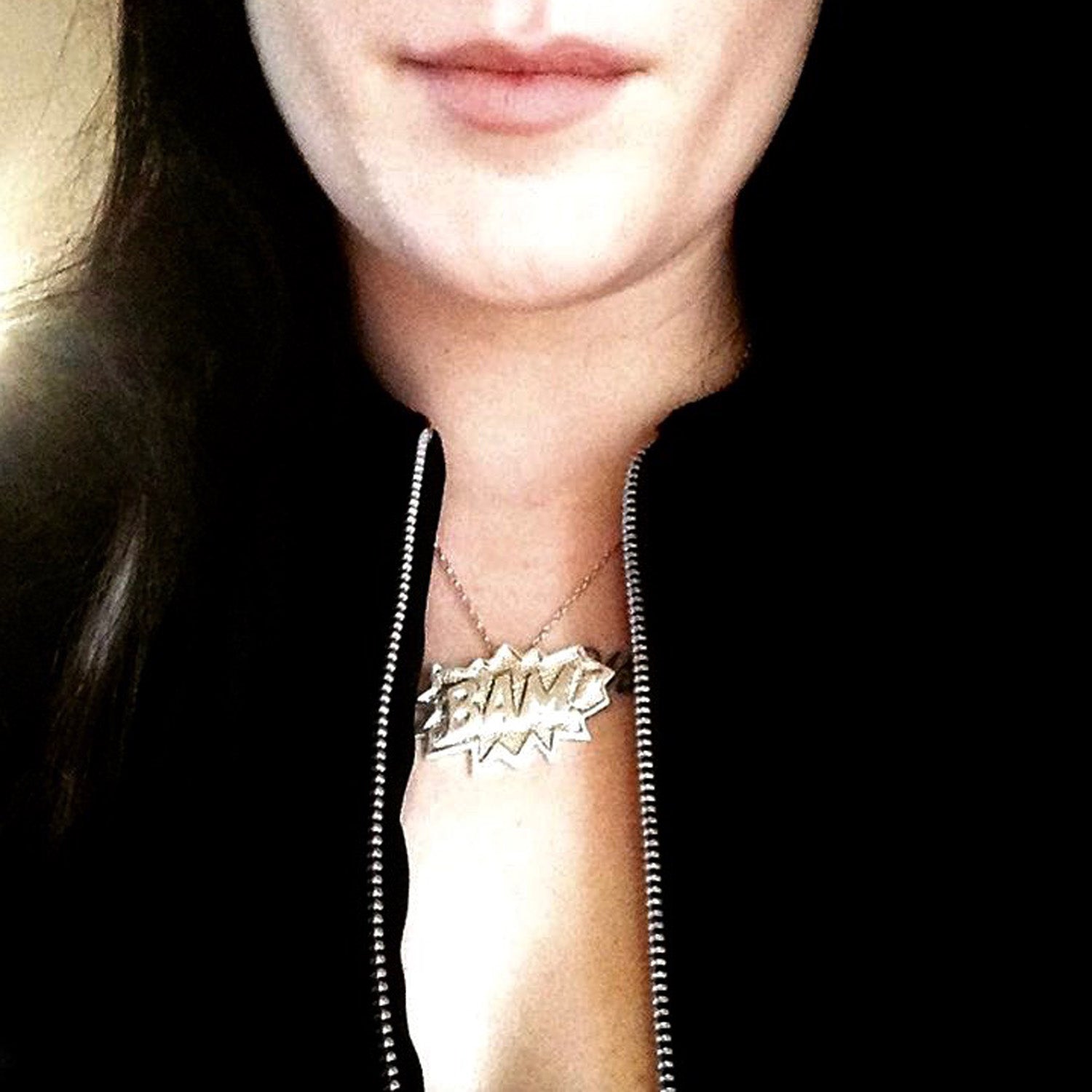 An extra-large, hallmarked, solid sterling silver POW! pendant with a central pendant loop. This highly detailed pendant has raised letters and edges and a dotted background texture inspired by Lichtenstein pop art and comic book illustration. Each dot was hammered into the master model by hand, in our workshop in Ireland. This pendant is removable and comes on a 18"/45cm belcher chain. From the Pop Art Collection.