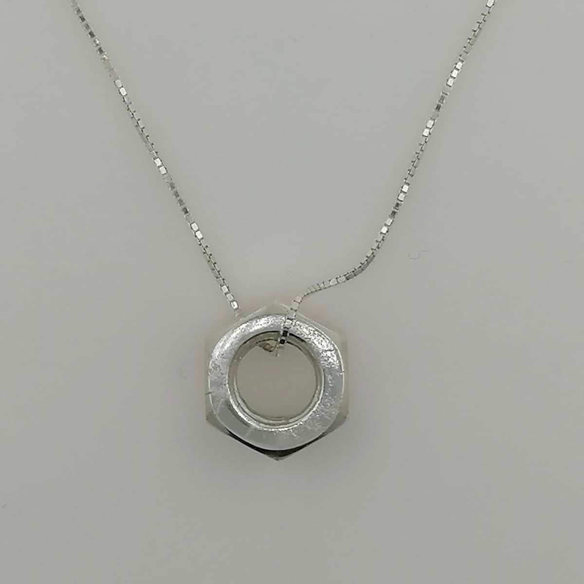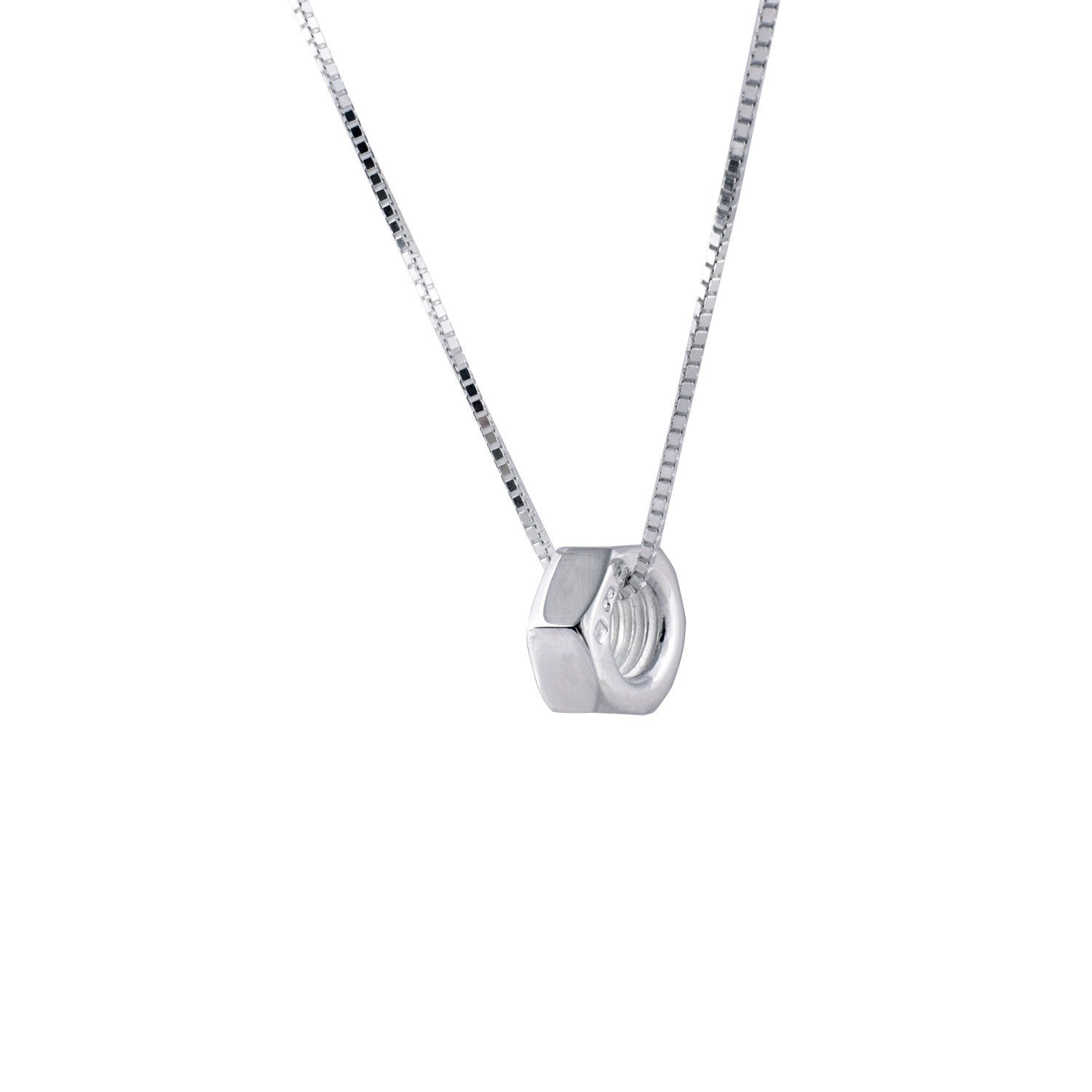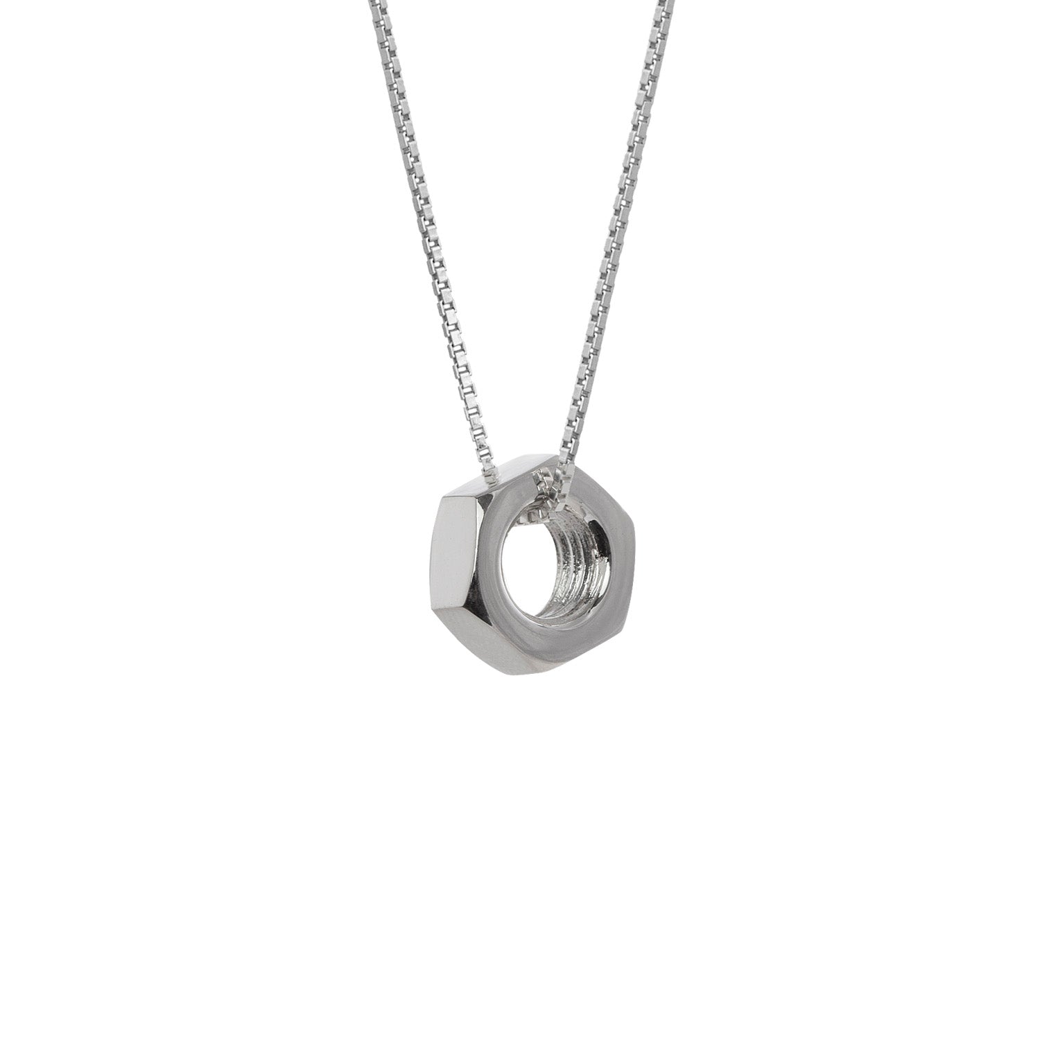 An extra large, hallmarked, solid, 100% recycled sterling silver hex nut pendant with a polished finish. It comes on a 1.5 gauge 22"/55cm long sterling silver venetian box chain with Edge Only's custom tag. The removable heavy-weight nut is approximately 15.5mm x 7mm and weighs 9.6 grams.
