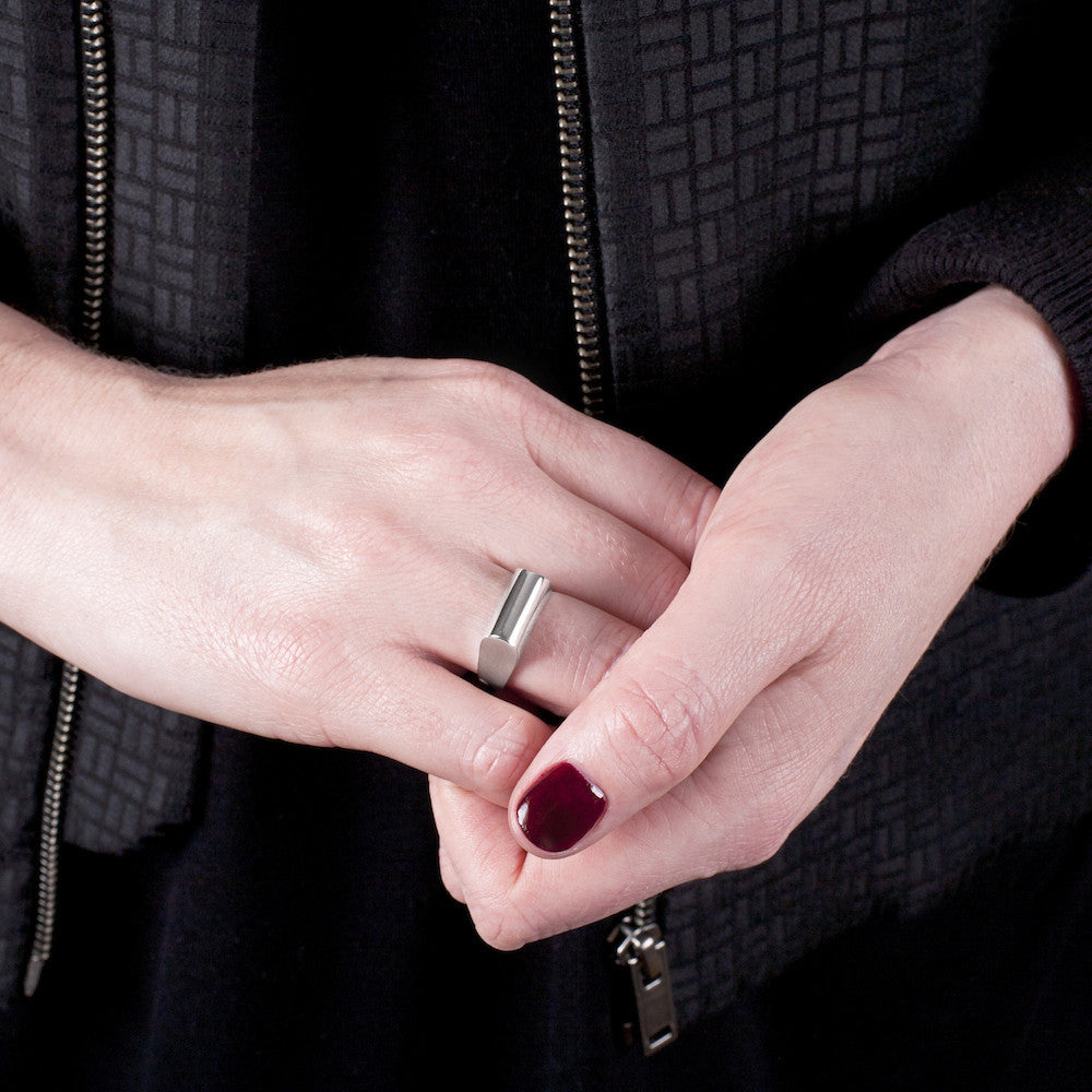 A hallmarked solid sterling silver ring with a smooth architectural shape and a highly polished finish. The domed "high" top is approximately 13.5mm wide x 6.8mm deep, tapering down to 3mm at the base of the ring. The gently tapered sides make this ring exceptionally comfortable to wear. From the Geometric Collection.