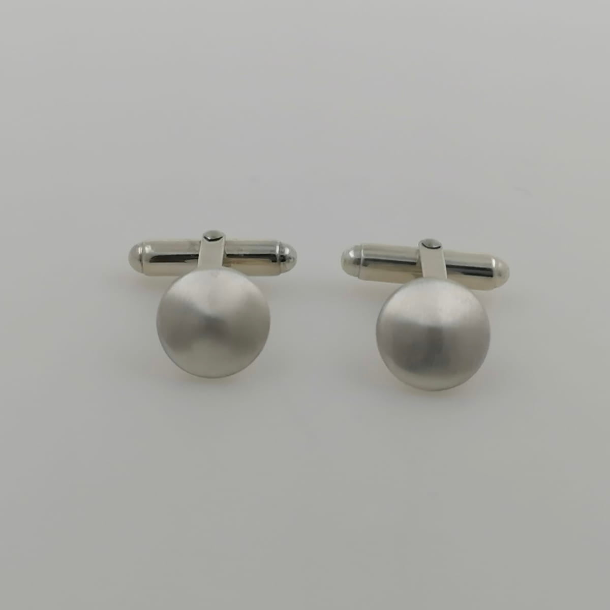 A pair of hallmarked sterling silver cone cufflinks with a matte satin finish. The rounded cones have a low apex and have sterling silver bullet back and toggle (swivel) links. They are approximately 11mm wide. An edgier dress stud!