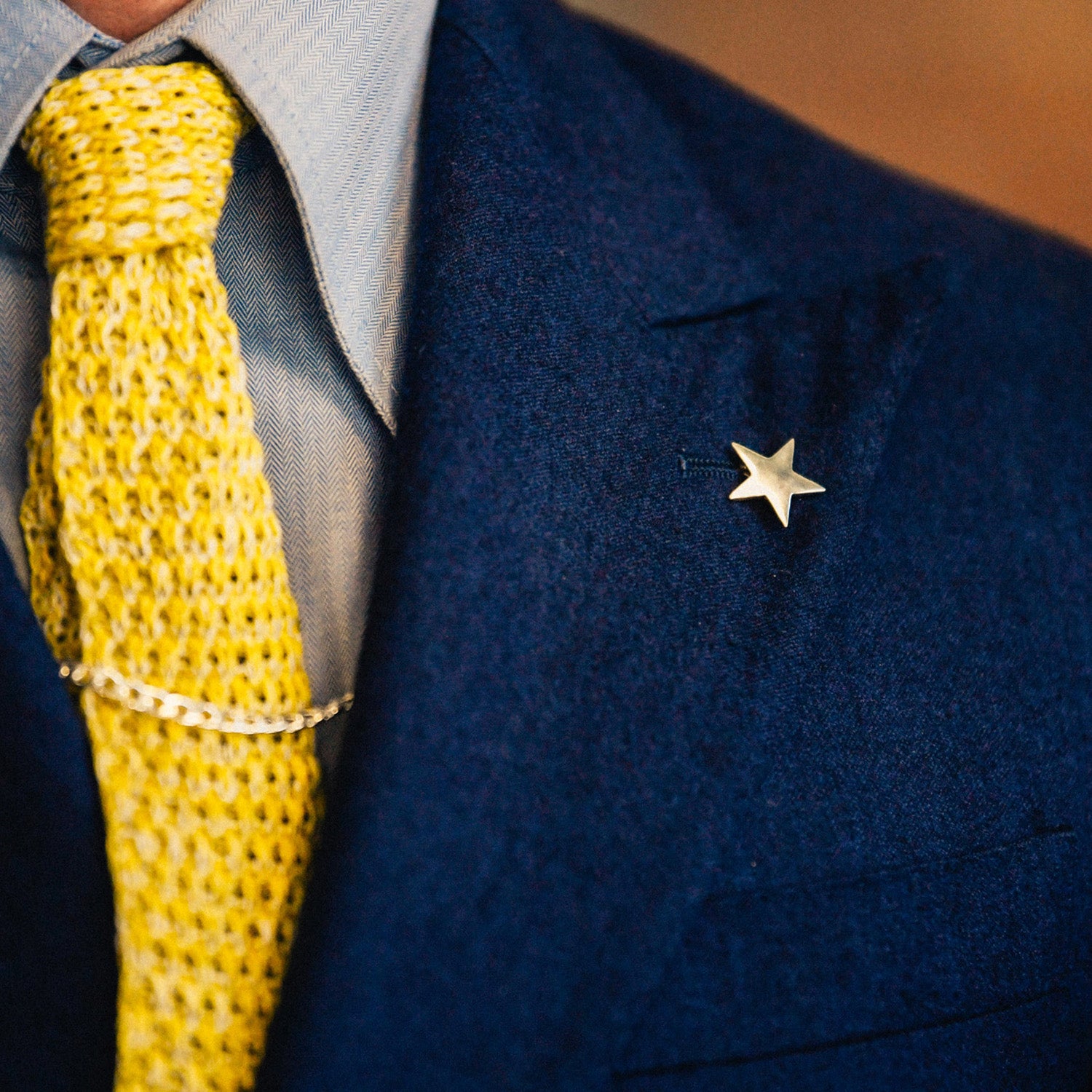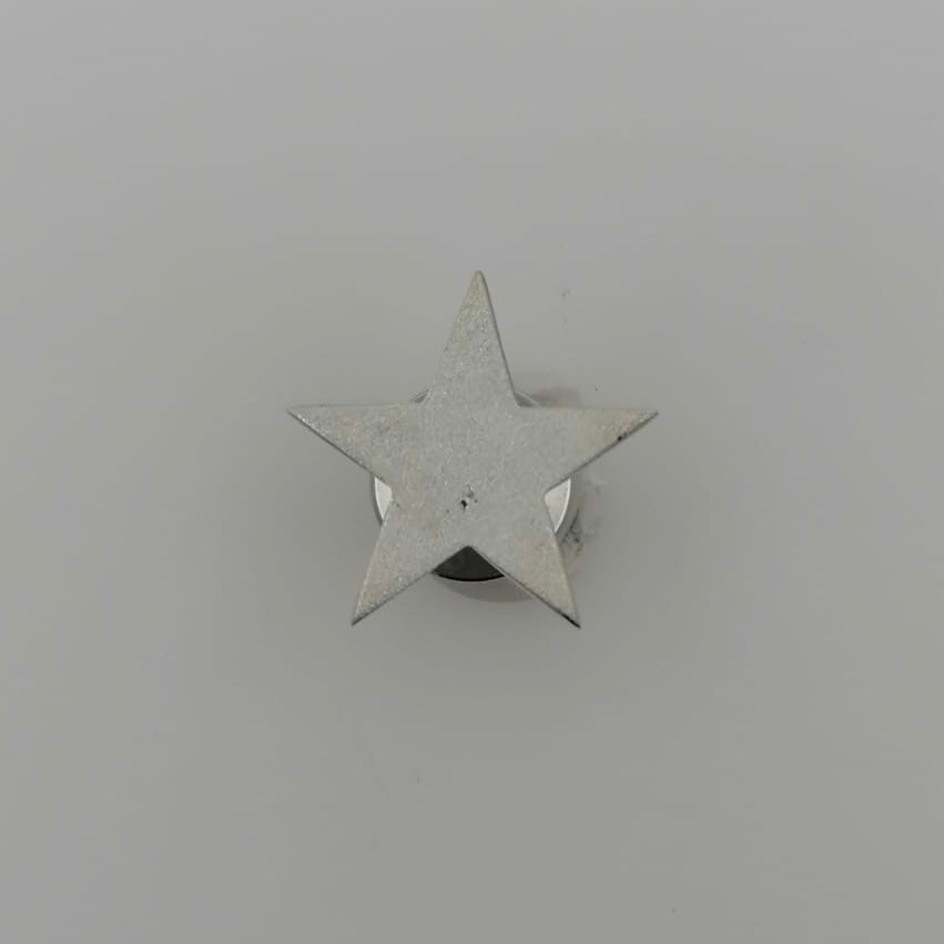 A hallmarked, solid, 100% recycled sterling silver star pin. This thick five-point star has a sterling silver pin and a nickel silver clutch back. From the Megastar Collection. Unisex.