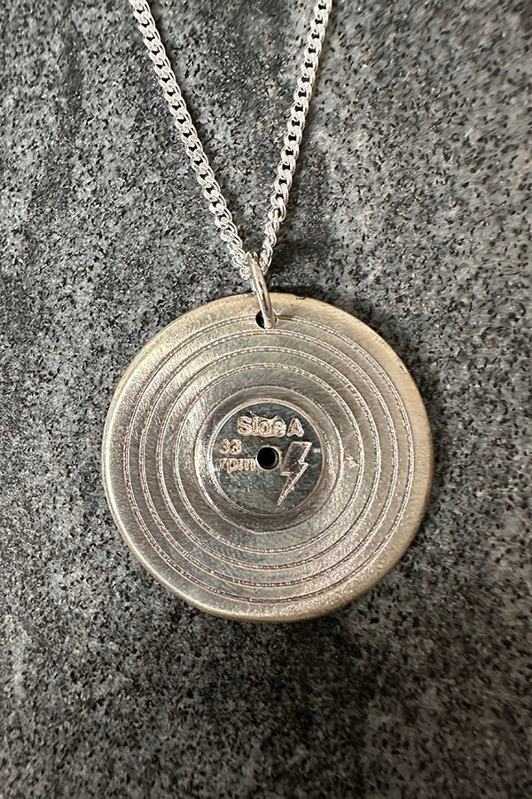 A solid 100% recycled sterling silver Vinyl Pendant with all the details. Unisex.